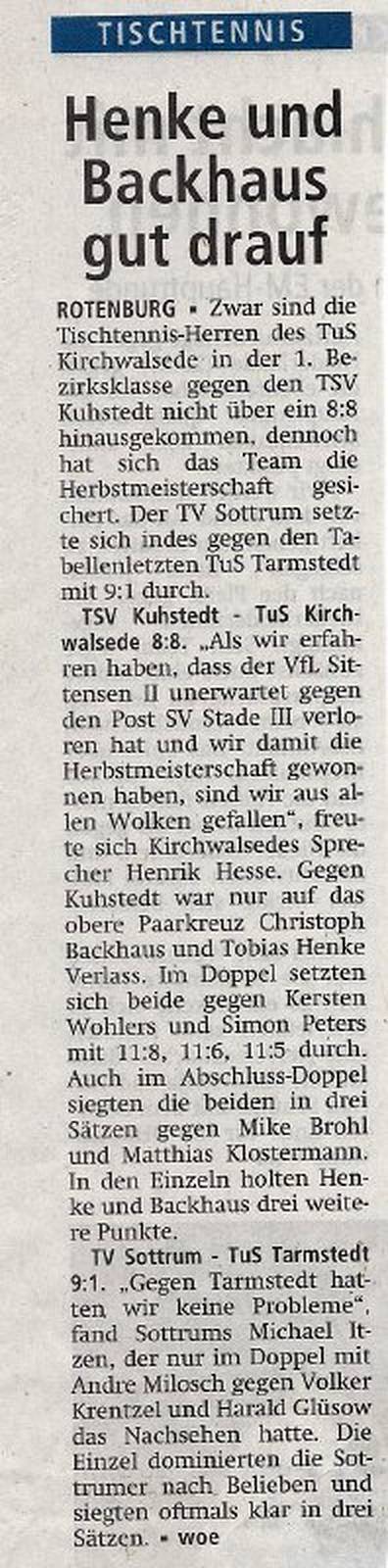 Weil Stade jedoch überraschend deutlich gegen Sittensen gewann, reichte den Kirchwalsedern zum Hinrunden-Abschluss ein mageres 8:8 in Kuhstedt, um Herbstmeister zu werden, da das Spielverhältnis für sie sprach. (siehe Bericht links!).